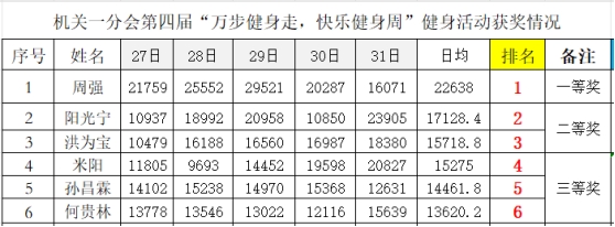 本次活动依托第三方专业计步小程序搭建线上参与平台,按照全体会员每天截止统计时间前的实际步数累积排名。活动期间,职工们纷纷利用工作间隙、通勤途中或休闲时间参与健步,小程序内的实时步数排行榜成为大家每日关注的“热点”,同事间相互鼓励、比拼进步的氛围十分热烈。经过一周的精彩比赛,最终,周强同志获得了一等奖,阳光宁和洪为宝两位同志获得了二等奖,米阳、孙昌霖、何贵林三位同志获得了三等奖。